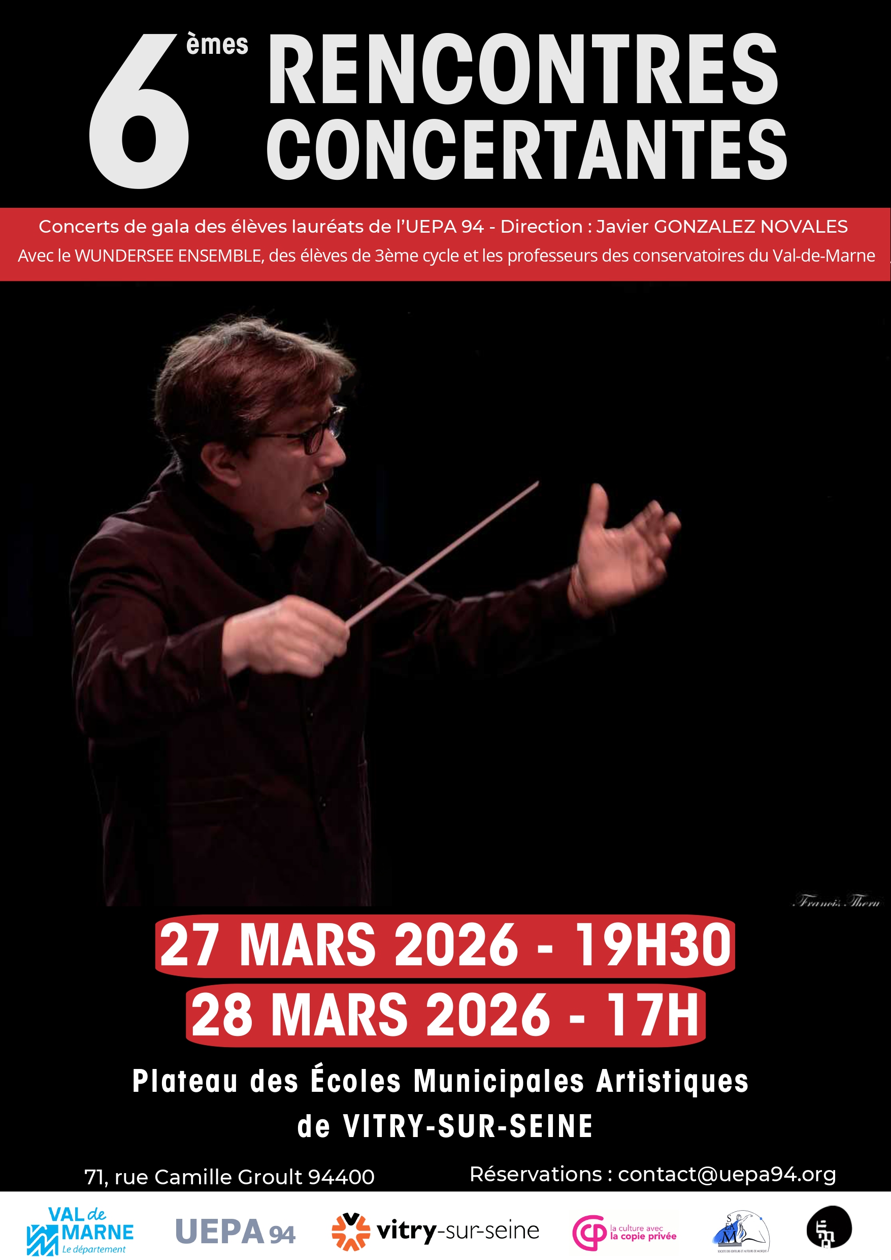 Cet évènement offre l’occasion aux grands élèves issus des établissements d’enseignement culturel du Val-de-Marne membres de l’U.E.P.A. 94, lauréats des examens départementaux U.E.P.A. 94, de se produire en solistes avec orchestre, cette année avec le WUNDERSEE ENSEMBLE, et des élèves de 3ème cycle et les professeurs des conservatoires du Val-de-Marne, sous la direction de Javier Gonzalez-Novales, chef d’orchestre et directeur du conservatoire de Vitry-sur-Seine.